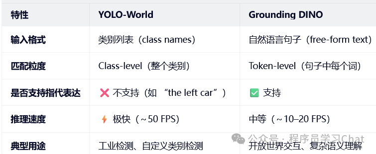 YOLO-World 更适合**"我知道要检测什么,只是模型没学过"的场景,而Grounding DINO 更适合"我用语言描述我想找的东西"**的场景。