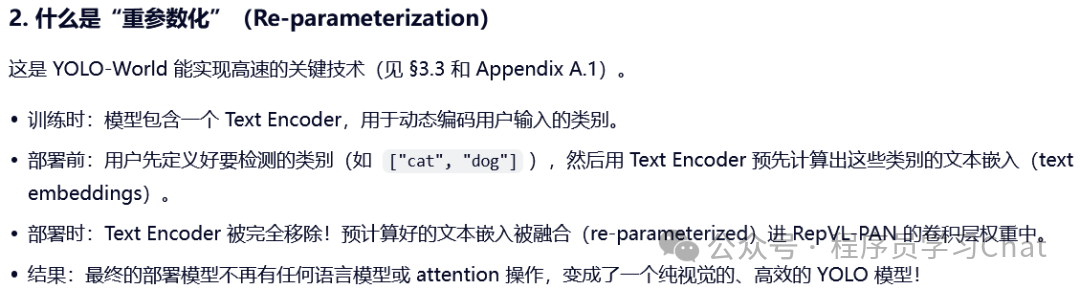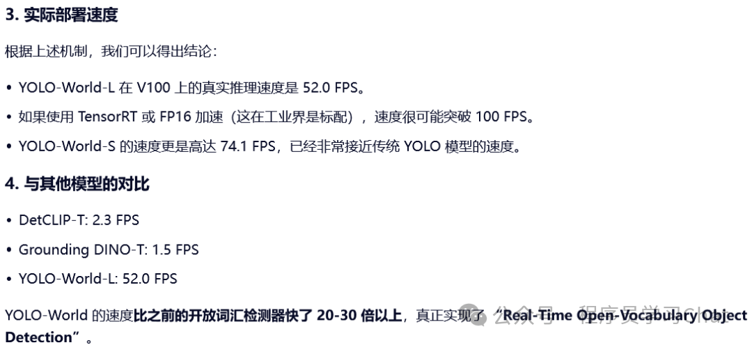 YOLO World类似Grounding DINO,也是解决开放集合目标检测的问题,但是使用的图像编码器是YOLO(具体是YOLO V8),相比于以往的开放集合目标检测模型更轻量,推理部署阶段可进一步配合重参数化的技巧提升推理速度,使YOLO World接近于原始YOLO的速度,消费级显卡上可达70+ FPS。