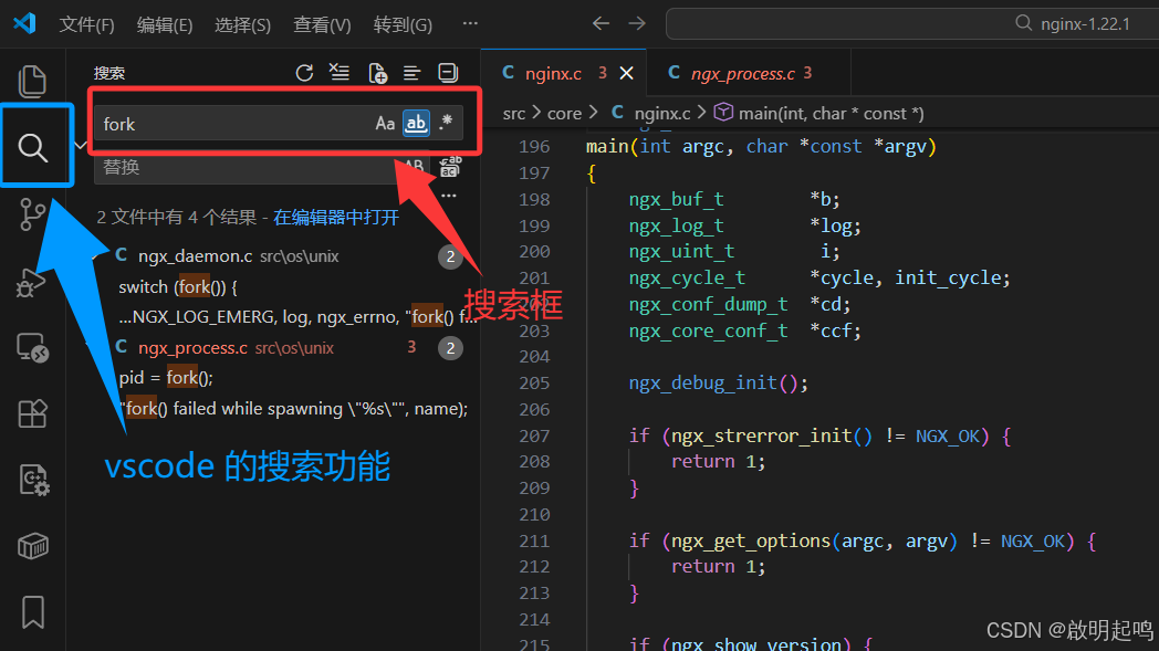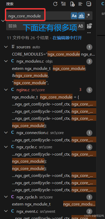 这是来自我上一篇文章的 nginx 配置文件,我们注意到 worker_processes 其实就是多进程的配置关键字,以此为线索,我们在 vscode 里面打开 nginx 的源码,使用搜索功能完成多进程机制的探索拆解。