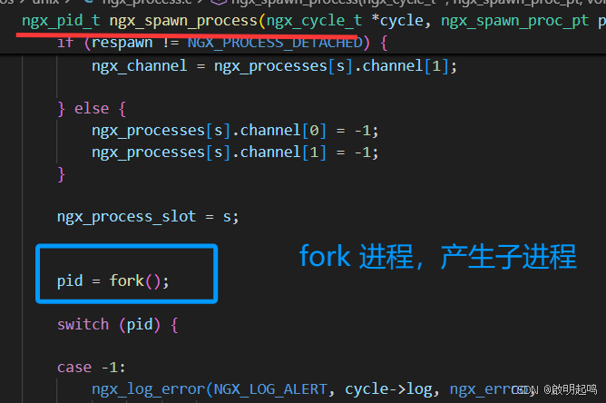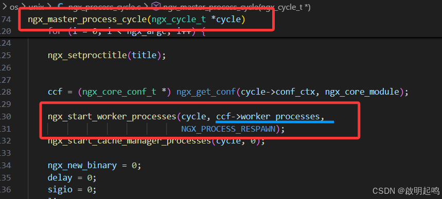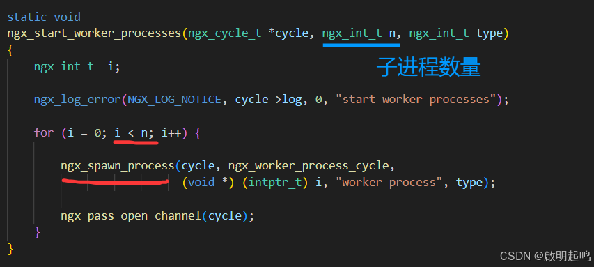 发现其里面还使用了 ngx_start_worker_processes 函数,里面确确实实传入了进程的数量 ccf->worker_processes 作为参数。 ngx_start_worker_processes 里面调用了 ngx_spawn_process 函数