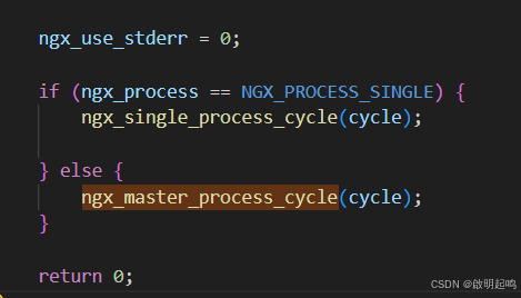 我们逐个去挑,按照变量函数的具体语义加以判断,发现按照函数 ngx_master_process_cycle(ngx_cycle_t *cycle) 这个栈往下走(一看就知道这个函数跟 "主进程有关"),我们发现他在主函数里面被调用 int ngx_cdecl main(int argc, char *const *argv),而且主函数里面有以下这两个函数