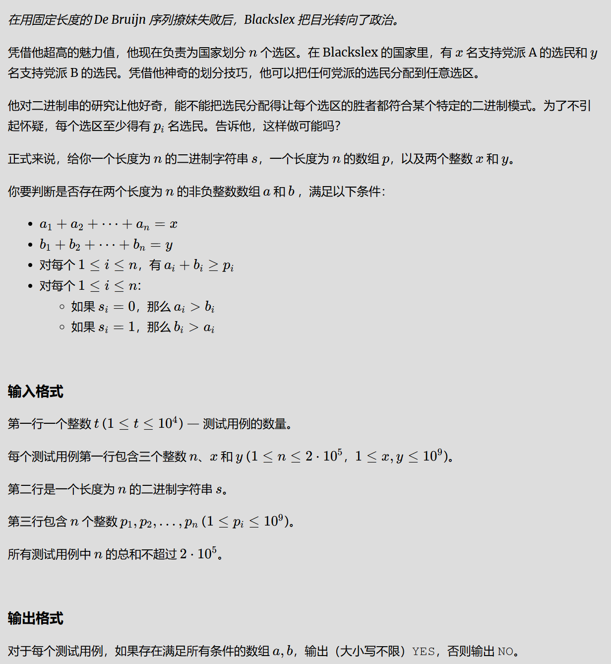 关键思路:本题的关键在于"每个选区至少 p i p_i pi张票"。即使我们满足了所有下界,剩余的票也必须分配到某些选区,且不能改变原有的胜负关系。