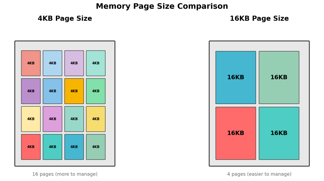 现在的手机动不动就是12GB、16GB的运存,内存已经足够大了。在这种情况下,继续用4KB的小格子来管理内存,反而会带来额外的开销。换成16KB的大格子,虽然可能会稍微多用一点内存,但是整体效率会提升很多。