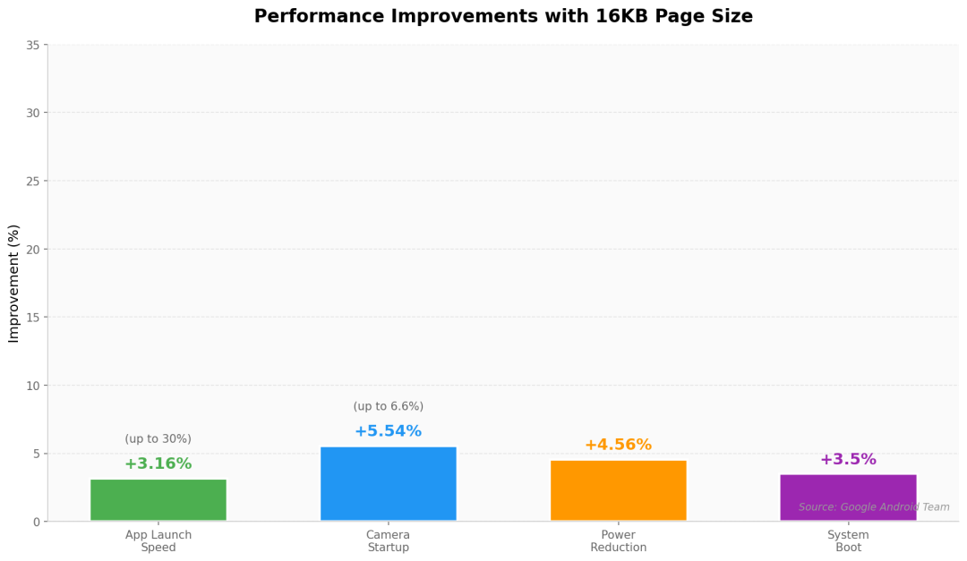 根据Google的官方数据,使用16KB页面大小之后: