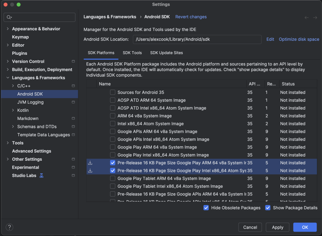 打开SDK Manager,勾选"Show Package Details",找到Android 15或Android 16的系统镜像,你会看到有标注"16KB Page Size"的选项。下载安装之后,创建一个新的AVD设备即可。