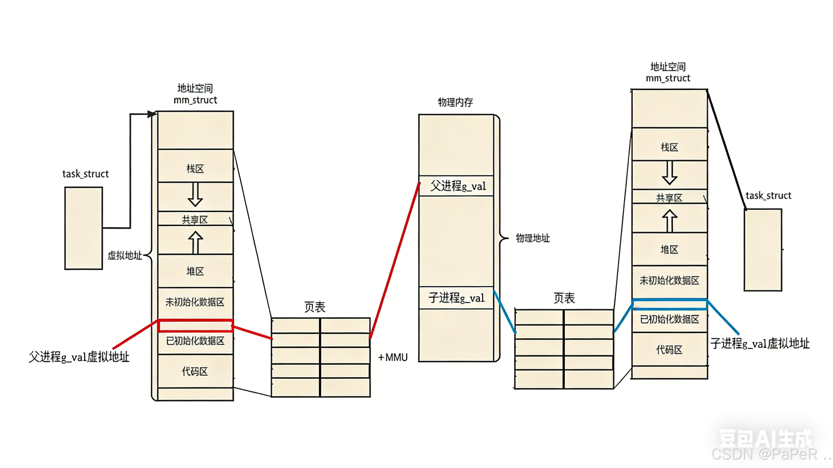 g_val所在的已初始化数据区)执行写入操作时,CPU 会检测到 "写只读页" 的异常。内核会为该物理页创建一个副本,更新子进程的页表,使其指向新的物理页。