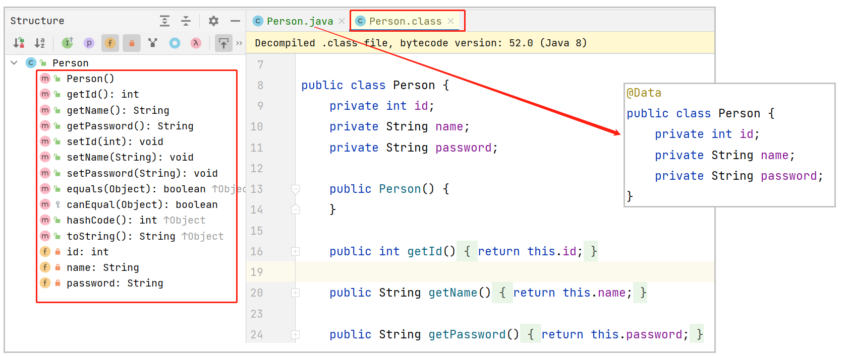@Data注解的效果就是:构造方法,toString方法,get和set方法,代码进行编译的时候,自动生成。