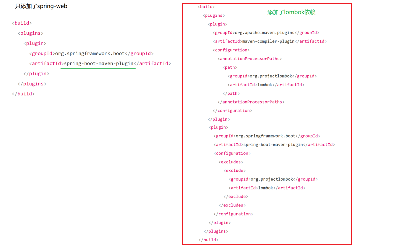 右边的代码,是添加了 lombok 依赖的pox文件。