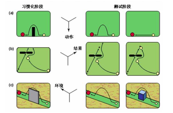 在Gergely等人(Gergely,Nádasdy,Csibra和Bíró,1995)的实验中,在习惯化阶段,向婴儿重复呈现小圆圈绕过障碍物追逐大圆圈,在测试阶段去掉障碍物,向婴儿呈现小圆圈直接追大圆圈和小圆圈按原路(绕路)追逐大圆圈两类事件,由于小圆圈直接追逐大圆圈比习惯化阶段的原路追逐更高效。6个月的婴儿会认为绕路的情况违背预期,从而注视更长的时间(图3a)。上述研究证明了观察到环境限制和动作结果后,婴儿能够推论出动作。Csibra,Biro,Koos和Gergely (2003)将这个实验进行扩展,考察了婴儿观察到动作和环境限制之后,是否能推测动作结果。实验者在习惯化阶段呈现小圆穿过障碍物大圆绕过障碍物,之后被屏幕遮住导致不能看到动作结果。在测试阶段去掉障碍物,呈现两类事件,一类是大圆追到小圆后继续向前,另一类是大圆追到小圆后停下,构成追逐动作(图b)。结果发现,12个月的婴儿对前一类事件产生去习惯化,说明这类动作结果与他们的推论不符。研究者还研究了婴儿观察到动作和结果之后,是否能推测环境限制。在实验中,一块不透明的板子遮住部分环境,婴儿看到一个圆圈在被板子遮住的地方绕路前进,在测试阶段去掉板子呈现有障碍物和无障碍物两类环境(图c)。12个月的婴儿对无障碍物的环境产生去习惯化,说明他们在习惯化阶段推论出板子后应该有障碍物。