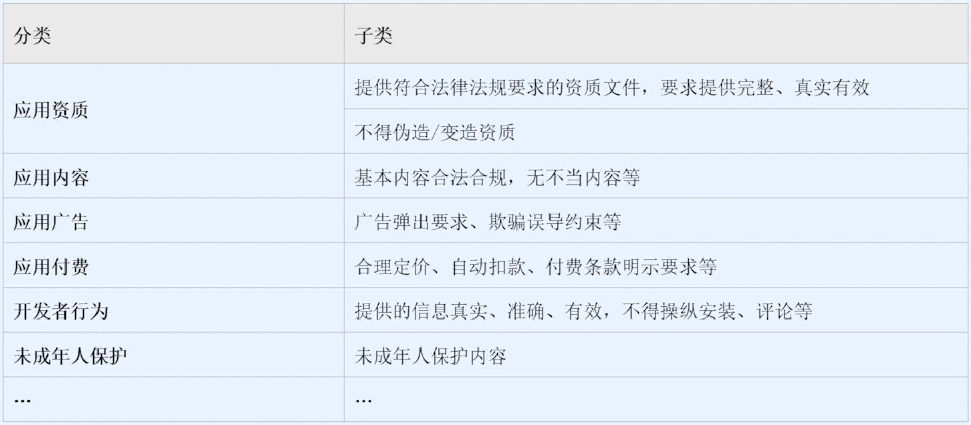 资质、内容、广告、付费、开发者行为、合规等。