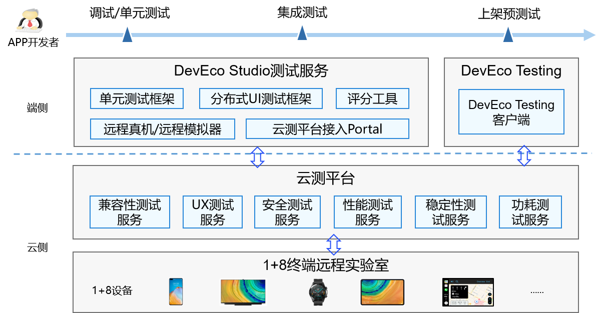 图1 HarmonyOS应用测试服务平台概览:介绍端侧和云侧提供哪些测试能力