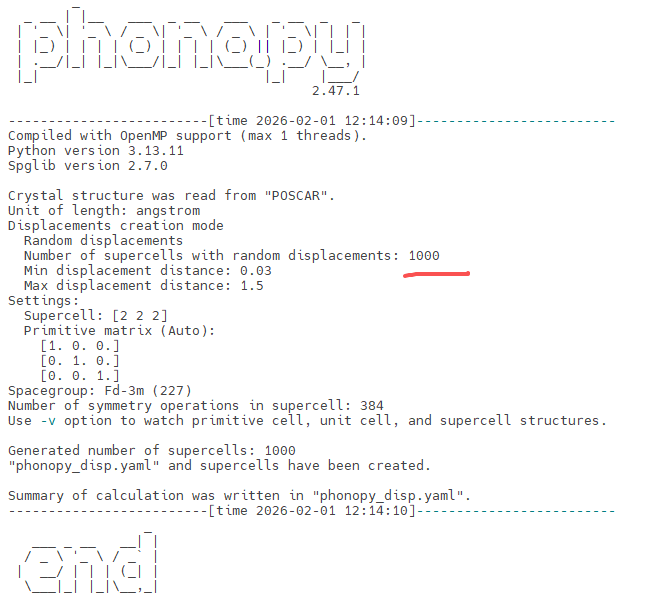 对产生的1000个结构进行VASP精度统一的自洽计算,计算完成后,使用phonopy读取计算所产生的vasprun.xml文件