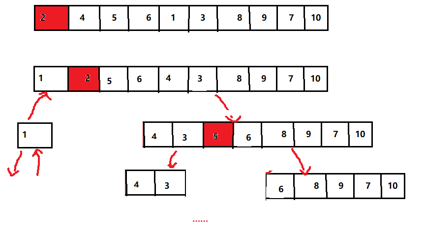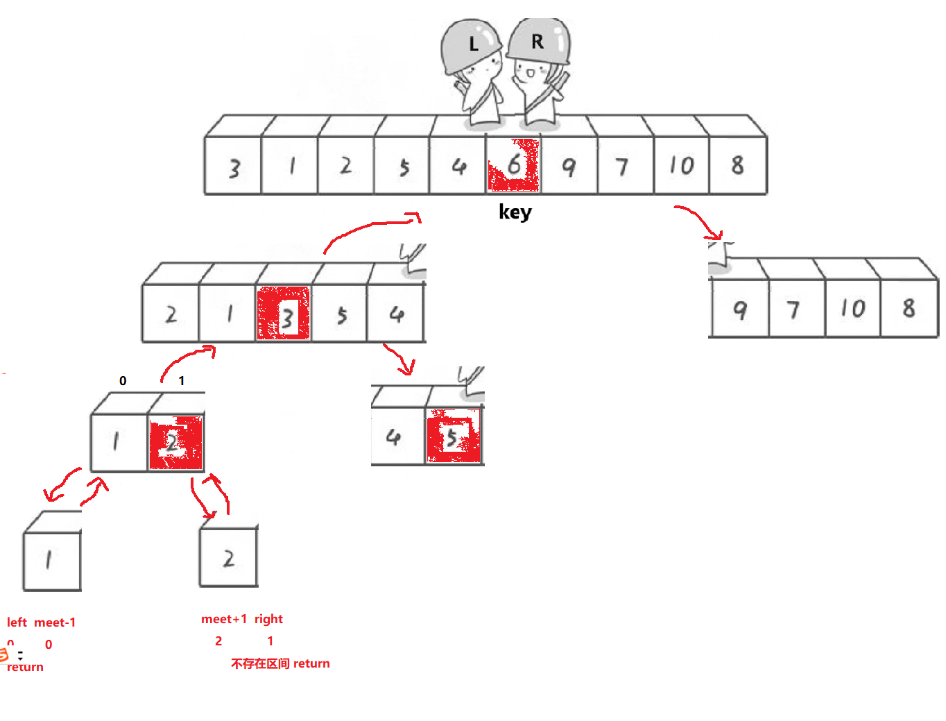 - 思路:开始的时候key值先储存起来,key值所在位置是坑,右边先走找小,互换坑位,再左边走找大互换坑位,左右相遇,将key值放在相遇的位置。