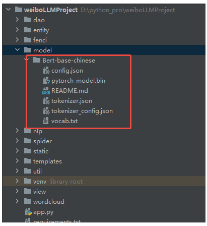首先新建model目录,把Bert-base-chinese粘贴到model目录下。