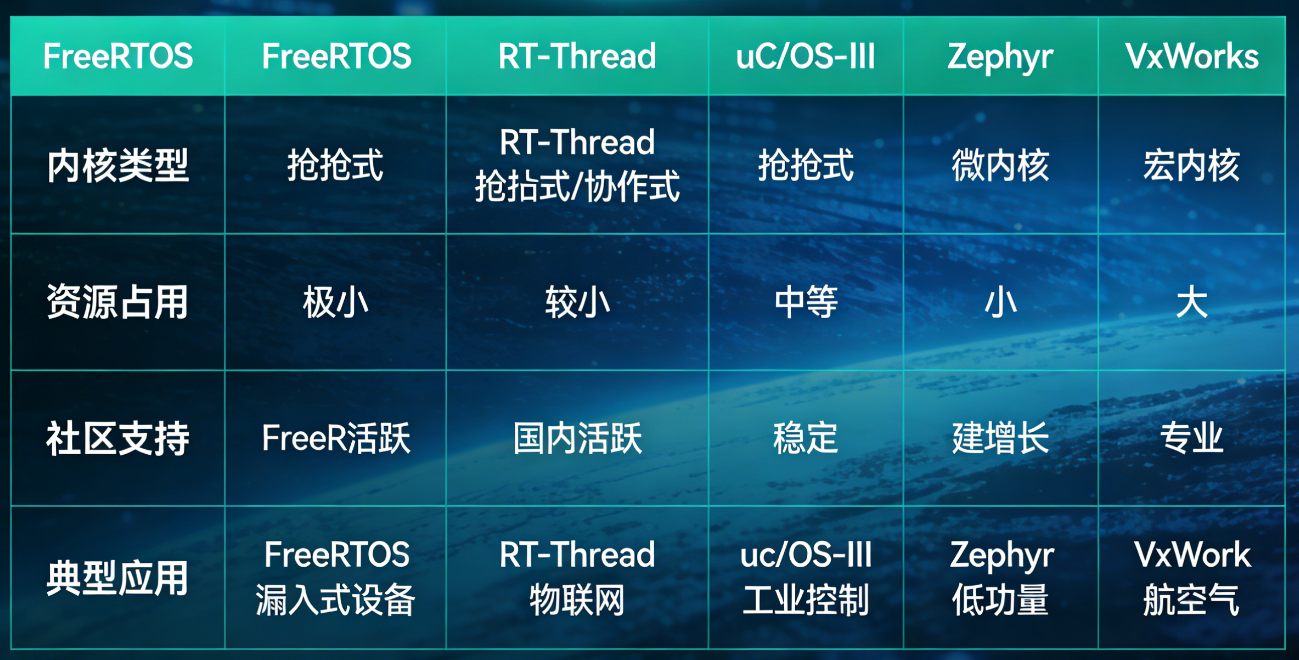 主流的嵌入式实时操作系统包含有:FreeRTOS、RT-Thread、uCos、Zephyr 和 VxWorks。