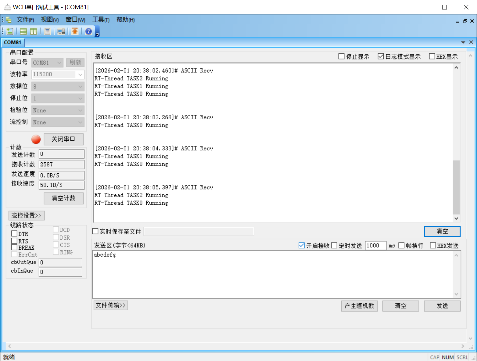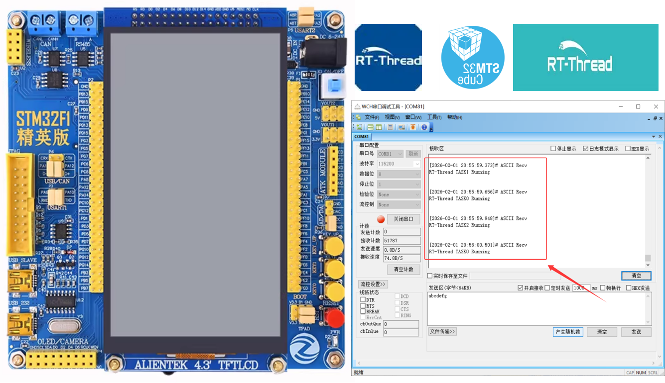 **硬件与软件:**STM32F103ZET6、RT-Thread、WCH COMTransmit