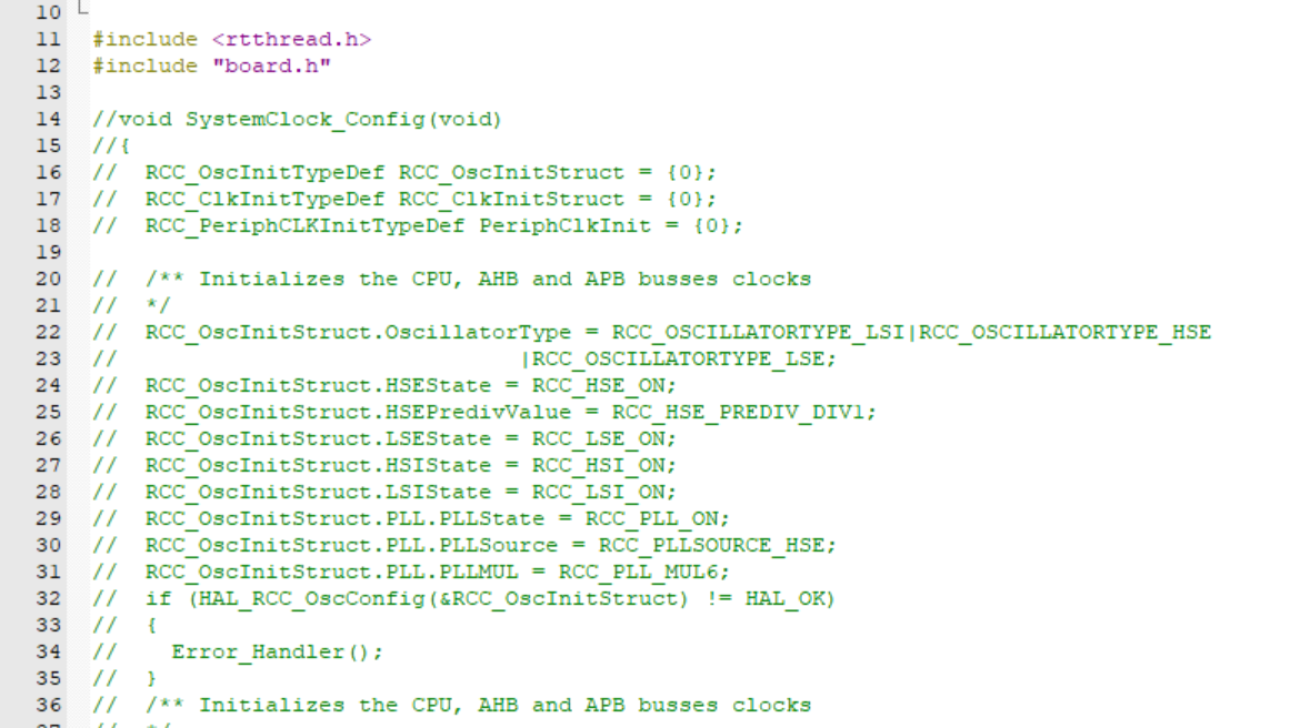 5、本来 RT-Thread 已经定义了 void SystemClock_Config(void),这里注释掉 board.c 的 SystemClock_Config,后面将使用 STM32CubeMX 生成的 SystemClock_Config;