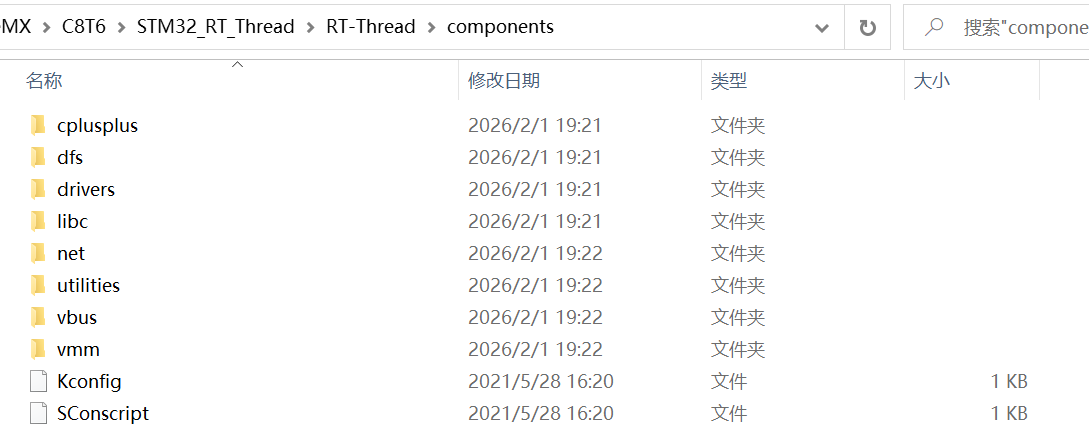 存放 RT-Thread 3.1.5 的标准化可裁剪组件,是区别于 2.x 系列的核心(2.x 无标准化组件体系),所有组件基于内核实现,独立编译、可按需开启 / 关闭,开发中直接调用组件 API 即可,核心组件包含:1、finsh/: RT-Thread 专属的命令行调试组件(Shell),支持串口命令交互、查看系统状态、调用自定义函数,3.1.5 新增命令补全 / 历史记录功能;**2、drivers/:**通用设备驱动框架,定义 SPI /I2C /UART /ADC 等外设的标准化驱动接口,解耦上层应用与底层硬件驱动;