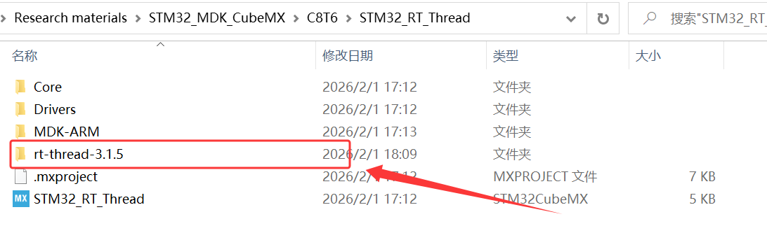 1、将解压的 rt-thread-3.1.5 源码复制到工程文件夹目录下,并创建一个 RT-Thread 文件夹;