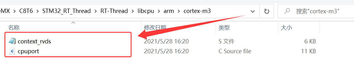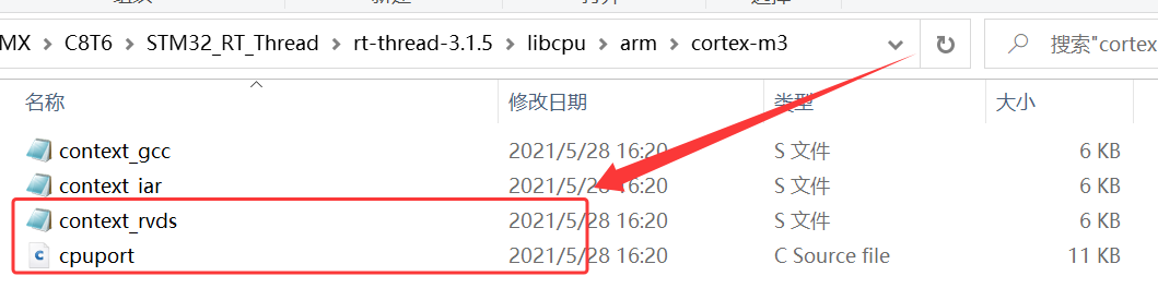 4、根据自己的实际硬件平台具有的内核架构选择,将 \STM32_RT_Thread\rt-thread-3.1.5\libcpu\arm\cortex-m3 下的 context_rvds.S、cpuport.c 复制到 \STM32_RT_Thread\RT_Thread\libcpu\arm\cortex-m3;