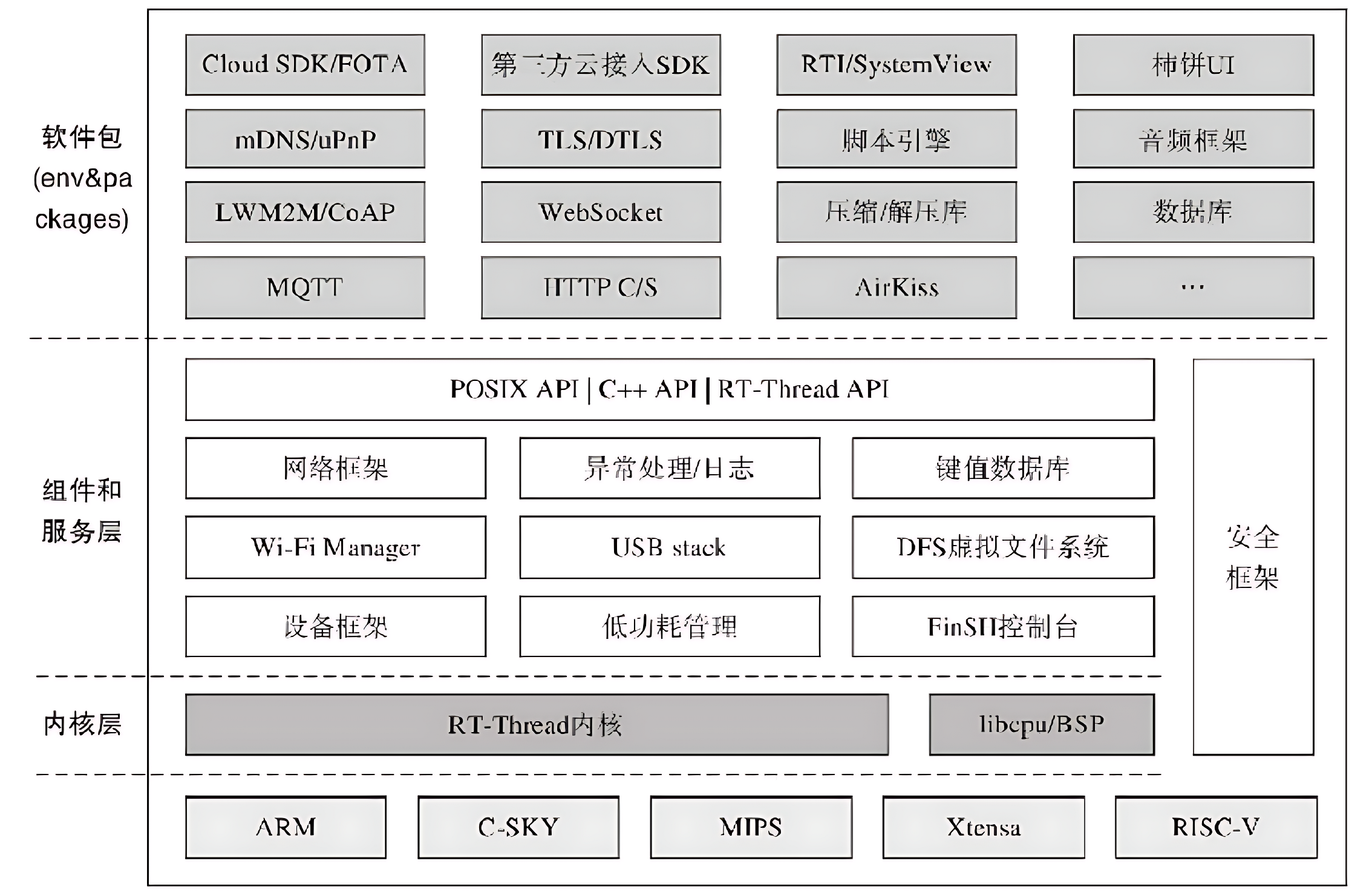 RT-Thread 的模块化设计分为:内核层、组件与服务层、软件包层。这样的设计既保证了系统的实时性与稳定性,又提升了开发灵活性。