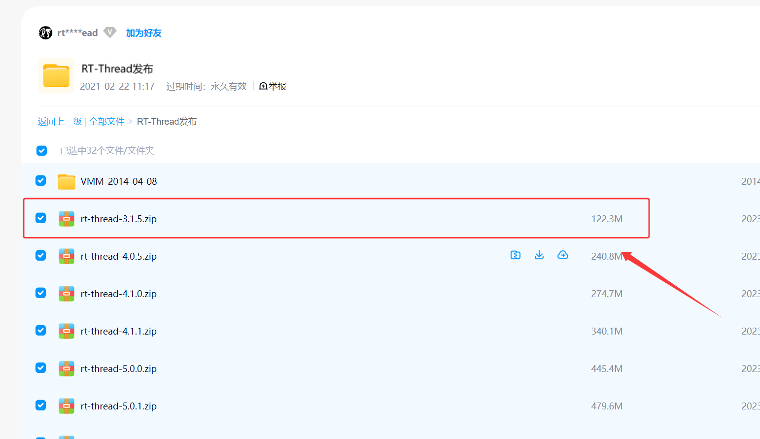 2、作者在百度网盘中这边选择 RT-Thread-3.1.5 的版本文件,大家可以根据自己的需求选择最新的版本;