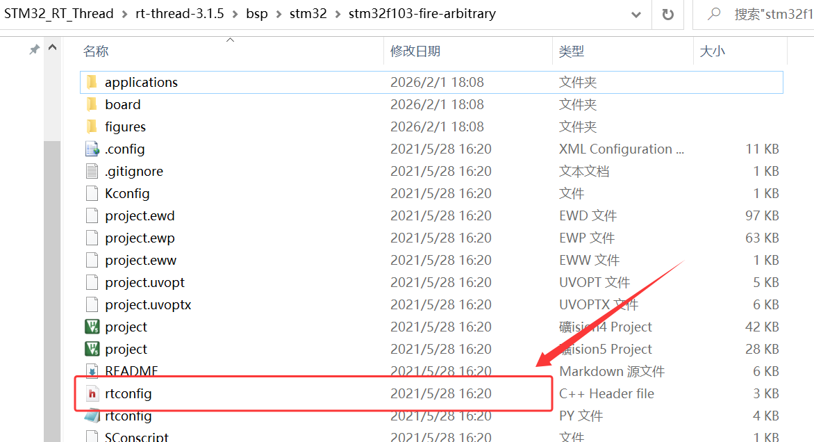 2、将 \STM32_RT_Thread\rt-thread-3.1.5\bsp\stm32\stm32f103-fire-arbitrary 下的 rtconfig.h 复制到 RT_Thread 下的文件夹 config;