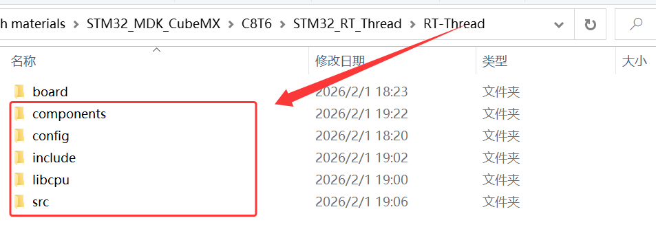 5、将 \STM32_RT_Thread\rt-thread-3.1.5 下的 include、src 和 components 文件夹整个复制到 \STM32_RT_Thread\RT_Thread 下,并且把 components下的 finsh 组件删除;
