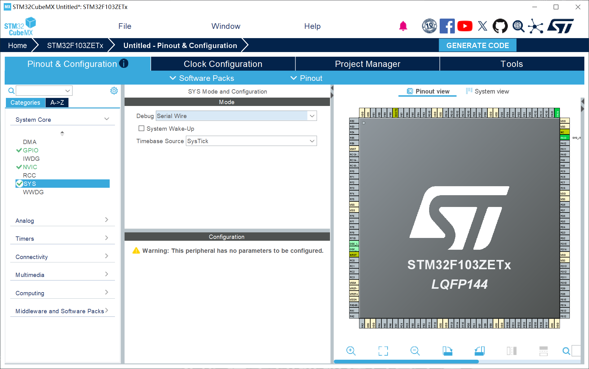 2、SYS配置:Debug设置成Serial Wire (否则可能导致芯片自锁);