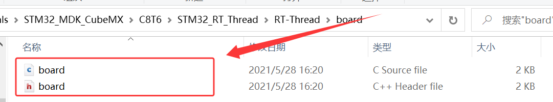 3、将 \STM32_RT_Thread\rt-thread-3.1.5\bsp\stm32\stm32f103-fire-arbitrary\board 下的 board.c、board.h 复制到 RT_Thread 下的文件夹 board;