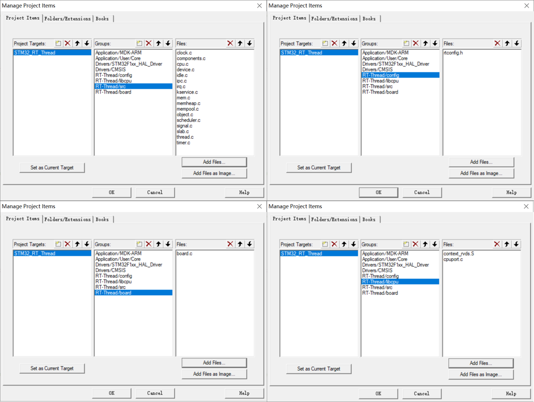 6、在 KEIL 里新建 4 个组别 RT_Thread/config,RT_Thread/libcpu,RT_Thread/src,RT_Thread/board,并在 4 个组内添加对应程序文件;