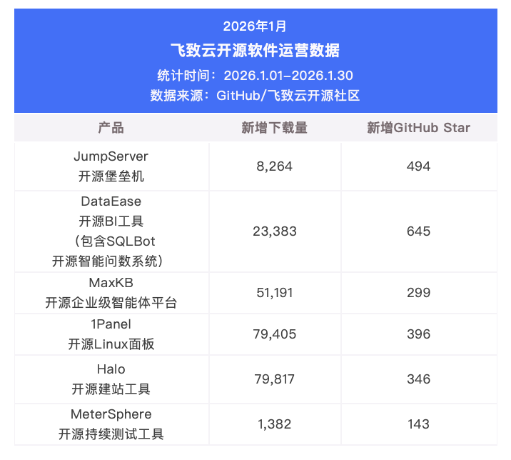 2026年1月飞致云开源软件运营数据概览(统计时间为2026.1.1~2026.1.30)