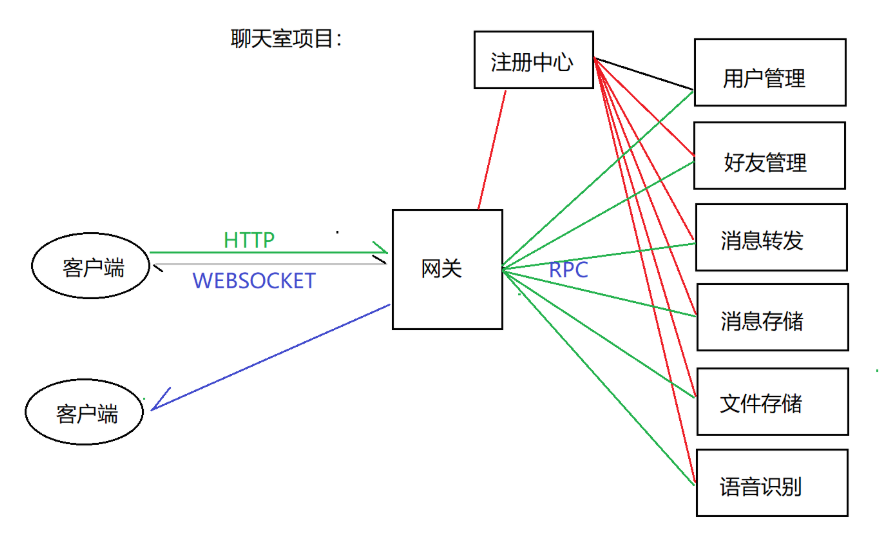 基于微服务的思想,以及聊天室项目的业务功能,将聊天室项目进行服务拆分为以下 几个子服务: