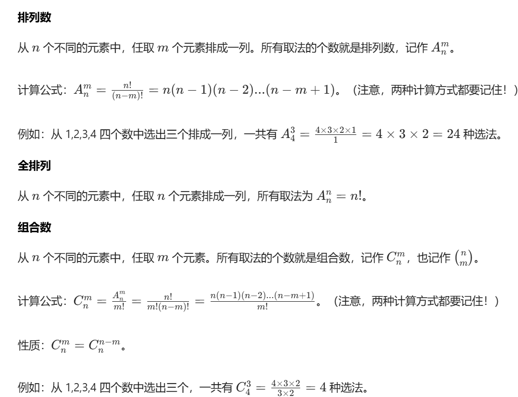 组合数 (mn) 表示的是从 n 个物品中选出 m 个物品的方案数。举个例子,从 (1,2,3) 三个物品中选择两个物品可以有 (1,2),(1,3),(2,3) 这三种选择方法。根据组合数的定义,我们可以给出计算组合数 (mn) 的一般公式: