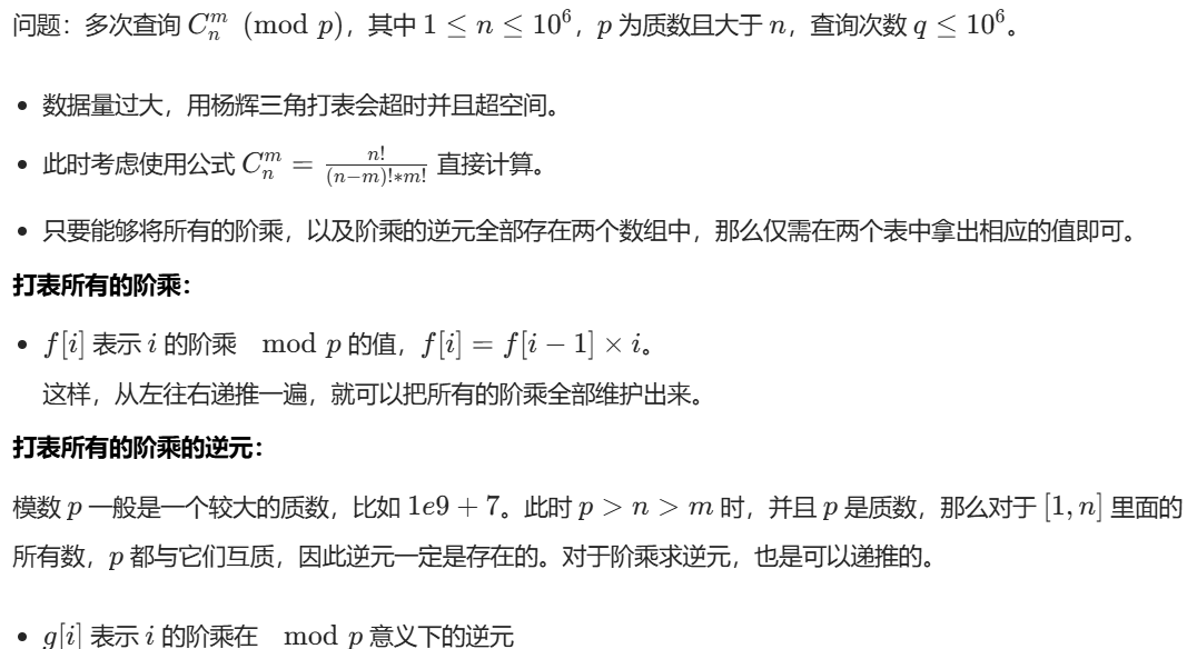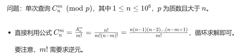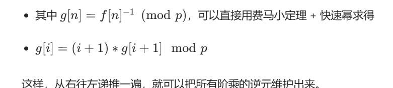* 取模下除法转乘法:除以 m! 等价于乘以 m! 的模 p 逆元(费马小定理)