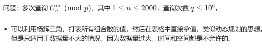 * 适用场景:多次查询C(n,m) mod p,且n≤2000、查询次数极多(如1e6次)
