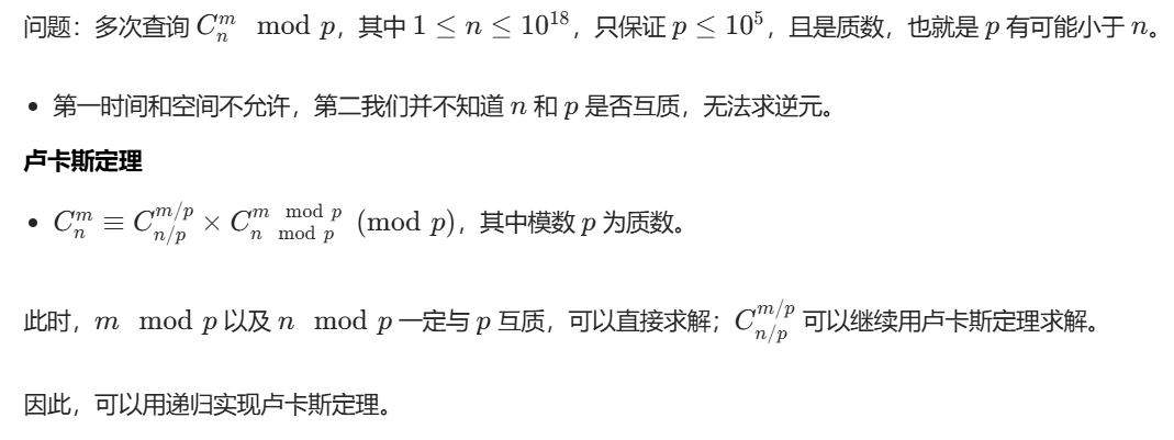 // 1. lucas(n/p, m/p, p):处理高位部分(n/p和m/p是整除结果)