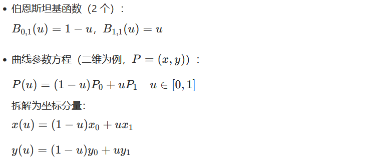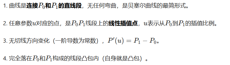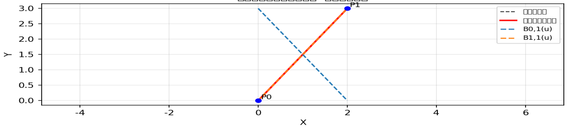 阶数:1 阶 | 控制顶点数:2 个(P0,P1)| 曲线形状:直线段(无弯曲,无曲率)