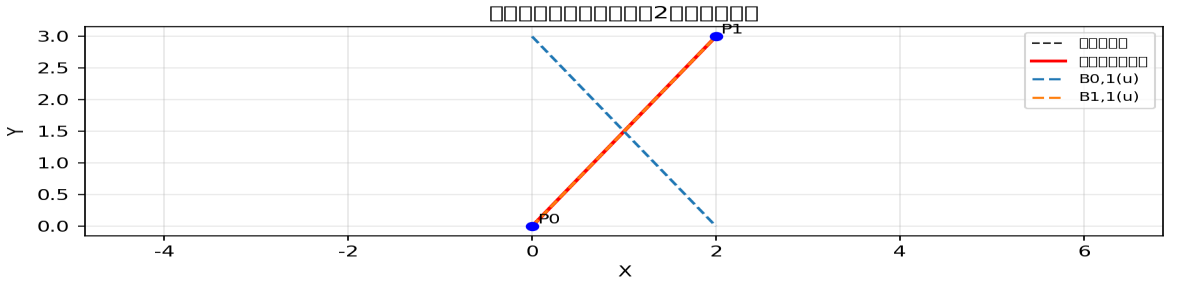 一次贝塞尔:红色直线段,与控制多边形完全重合,基函数为两条线性相交的直线,无任何弯曲。