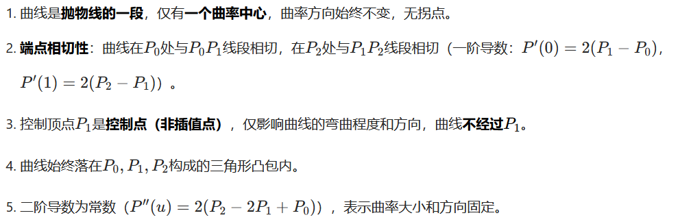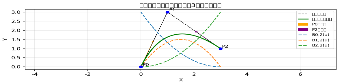 | 控制顶点数 | 2 个(P0,P1) | 3 个(P0,P1,P2) | 4 个(P0,P1,P2,P3) |
