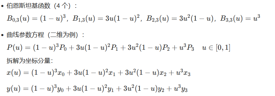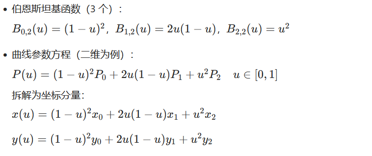 - 插值与控制:贝塞尔曲线仅插值首末顶点,中间顶点均为控制点(仅影响形状,不落在曲线上),这是与 B 样条曲线的核心区别之一。