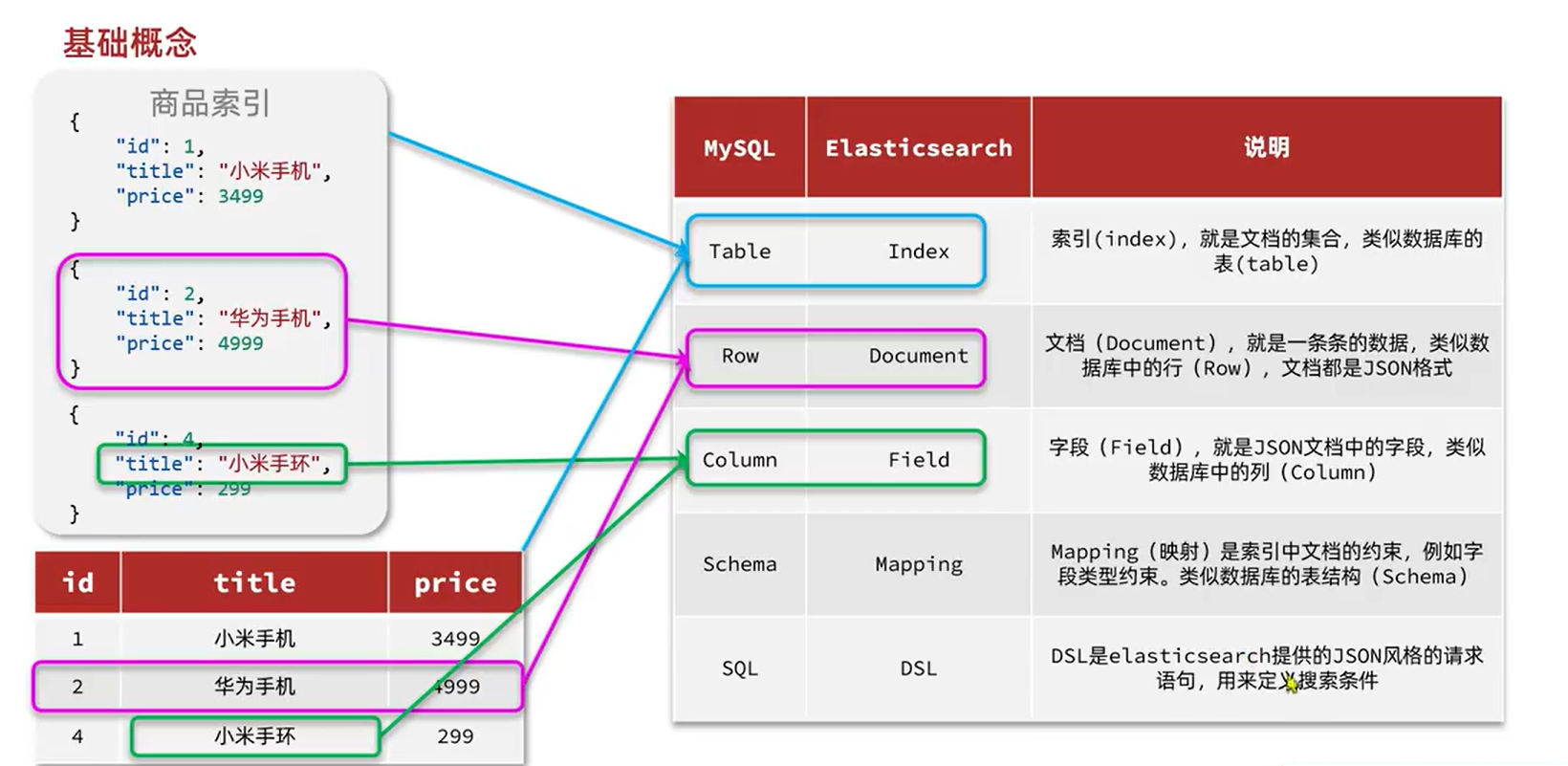 数据库的表会有约束信息,用来定义表的结构、字段的名称、类型等信息。因此,索引库中就有映射(mapping),是索引中文档的字段约束信息,类似表的结构约束。