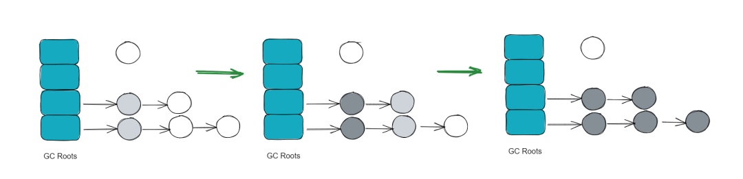 - 原理 :通过一系列称为 "GC Roots" 的对象作为起点,从这些节点开始向下搜索。如果一个对象到 GC Roots 没有任何引用链相连(即不可达),则证明该对象是不可用的。