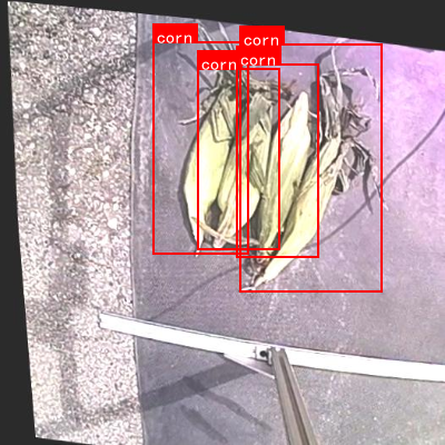 这张图片展示了玉米目标检测任务的场景。画面中,多根带外皮和部分叶片的玉米棒被放置在灰色地面上,周围用红色矩形框标注了多个"corn"标签,每个框精准包围单根或多根玉米,体现目标检测算法对玉米目标的识别与定位过程。地面左侧是粗糙纹理区域,右侧可见金属工具边缘,整体环境为户外或类似场景。从任务目标看,图片通过视觉化方式呈现了玉米目标检测的结果------红色框与标签明确标记出玉米位置,直观展现了算法对玉米这一特定目标的检测能力,可用于验证模型在真实场景下的识别效果,帮助分析检测精度、框选准确性等关键指标,是目标检测任务中典型的结果展示示例。