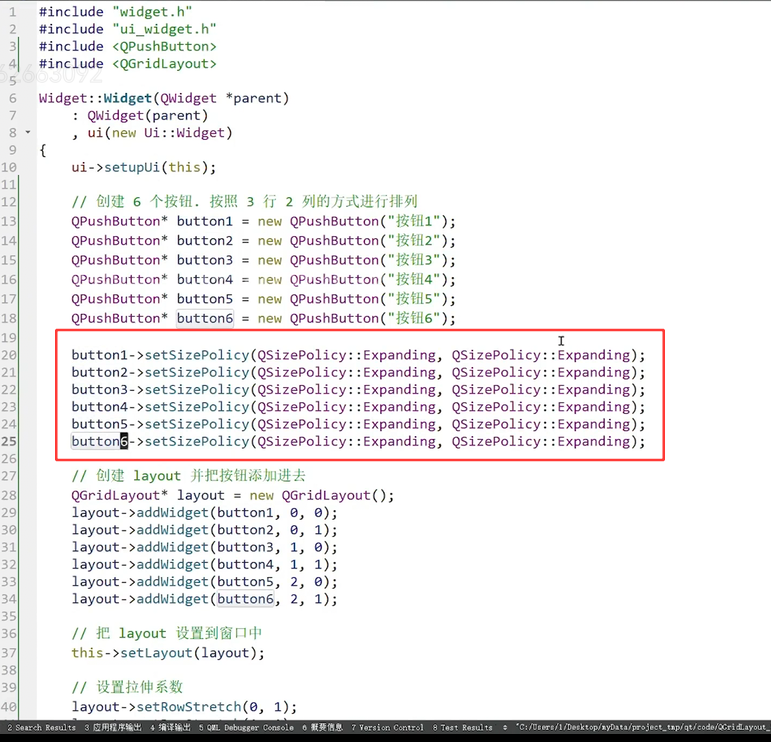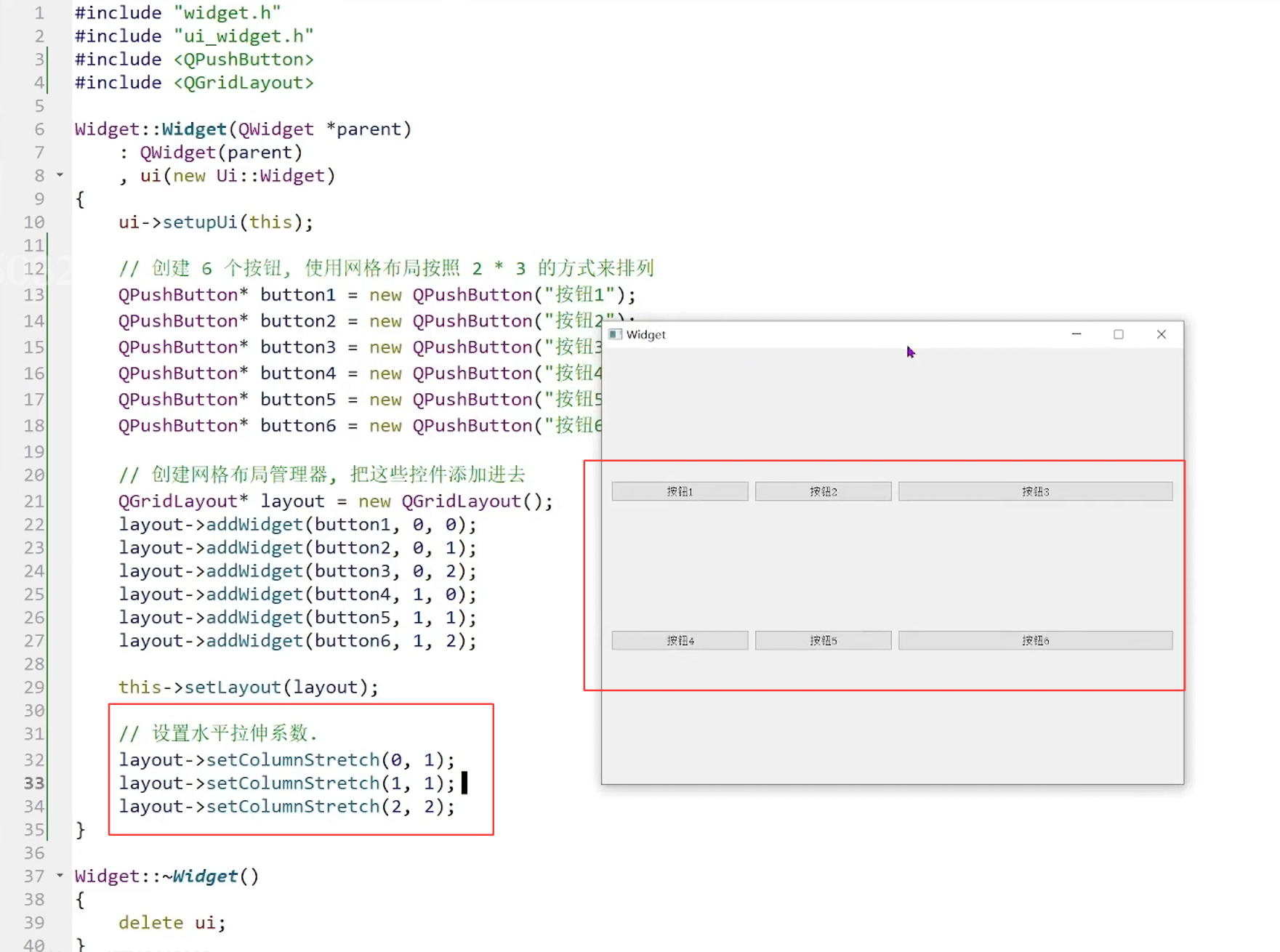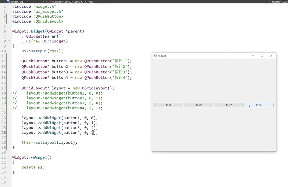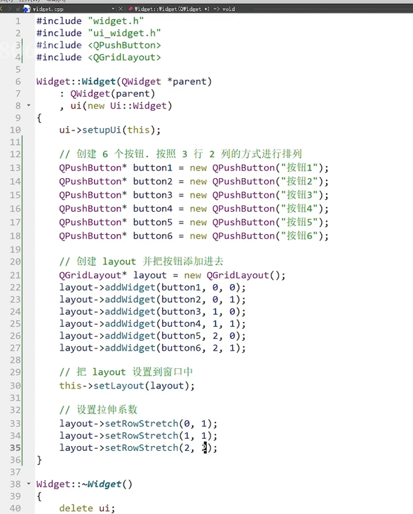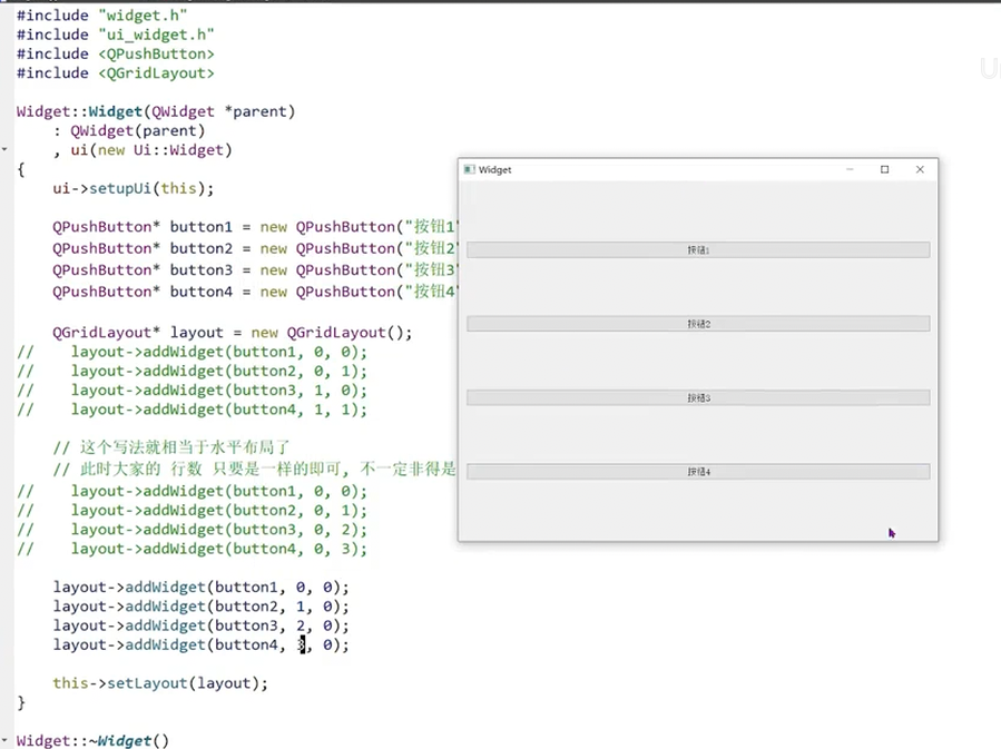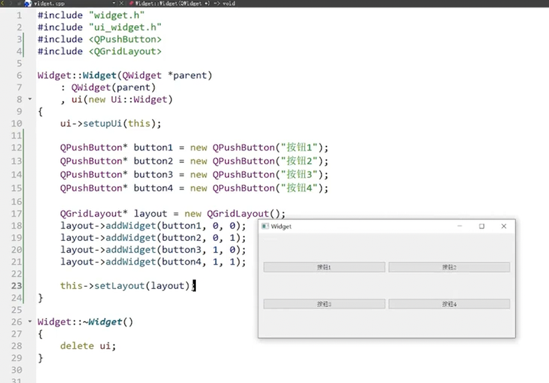 在上述代码中,addWidget 方法负责将 QPushButton 实例加入到布局管理器的内部列表中。当调用 this->setLayout(layout) 时,窗口部件(Widget)的所有权被移交给布局管理器,且布局管理器会根据窗口的当前尺寸计算每个按钮的几何位置。
