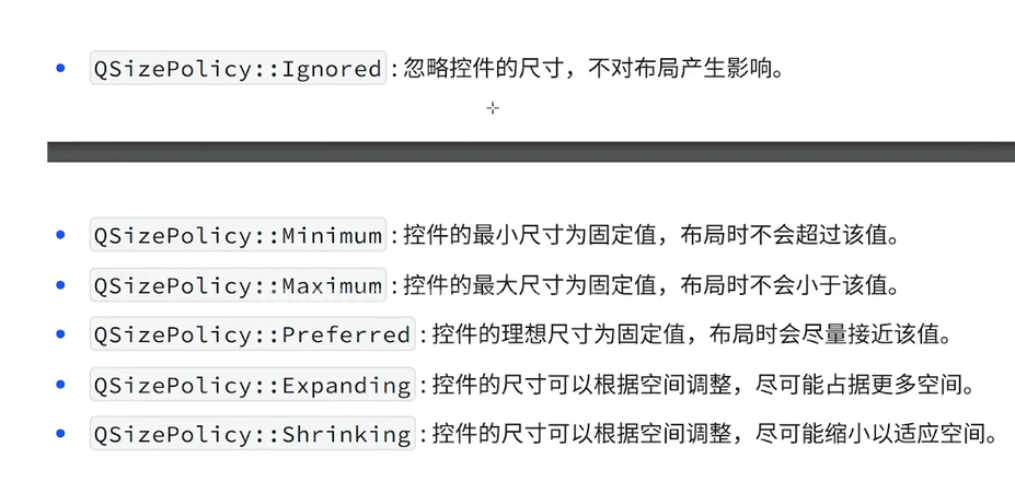QSizePolicy 定义了控件在布局中如何处理水平和垂直方向的缩放。常见的策略包括: