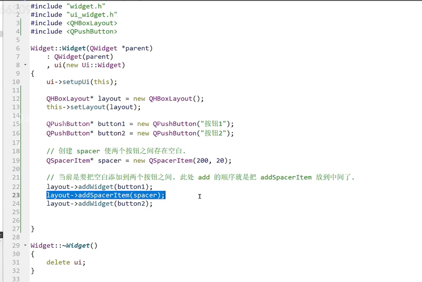 QSpacerItem 是一个不可见的布局项,它具有尺寸策略(通常是 Expanding)。在水平布局中,添加一个水平弹簧会将左右两侧的控件推向两端;在垂直布局中,垂直弹簧可以将控件推向顶部或底部。