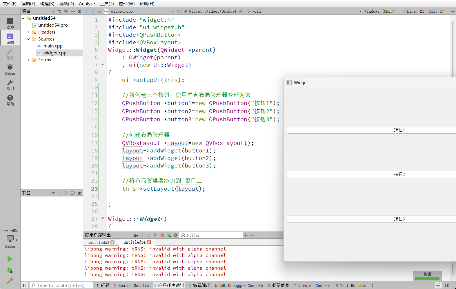 以下代码展示了如何通过 QVBoxLayout 管理三个按钮: