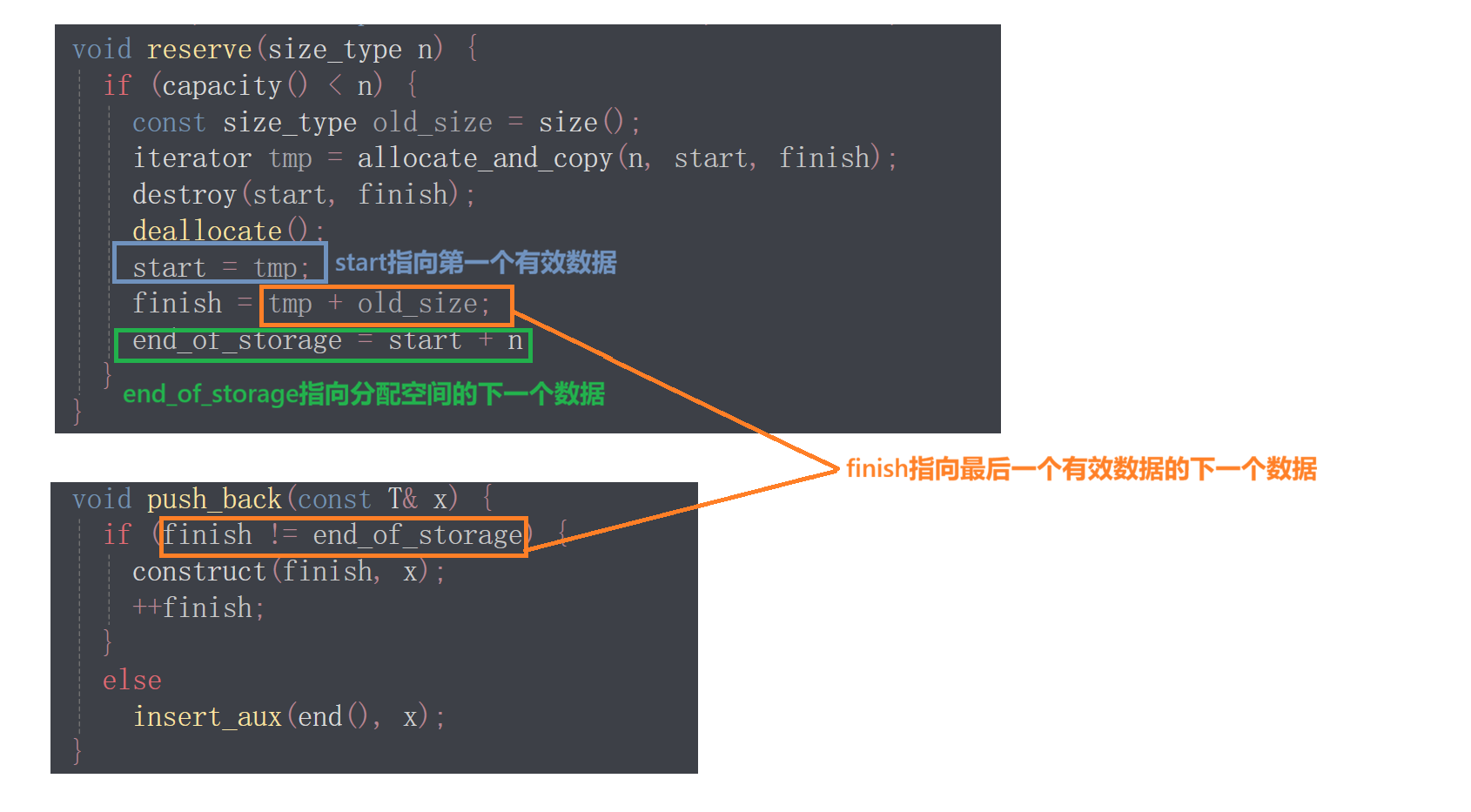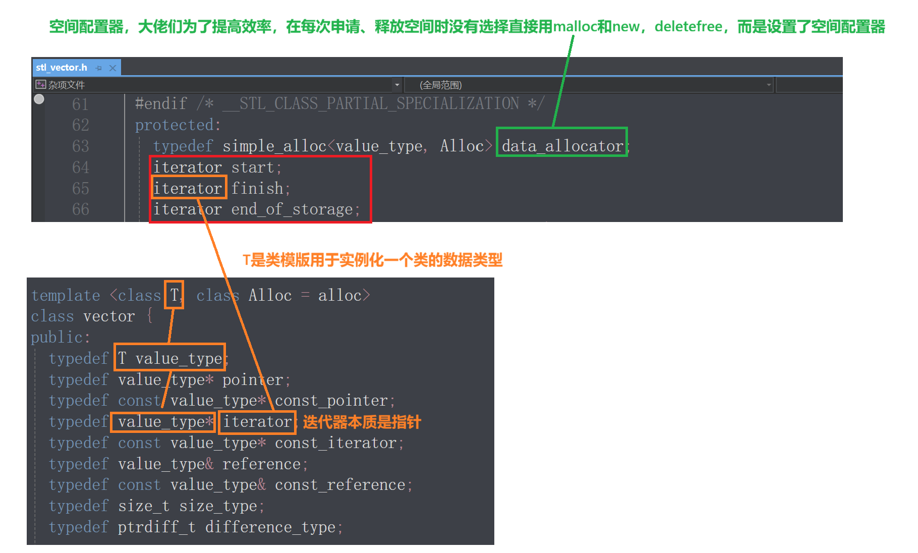 那我们在看源码时首先要关注什么呢?最忌讳的就是一头扎到细节里,一定要把握框架,比如我们今天看的vector是一个类,那么它的成员变量有哪些?各自都表征什么?(通过构造、插入等接口把握);以及主要的成员函数,比如析构等;看源码的时候可以结合变量名进行适当的猜测,再确认;不做完美主义者,不追求一遍就完全理解,留一些疑难杂症说不定看到后面自然就通了