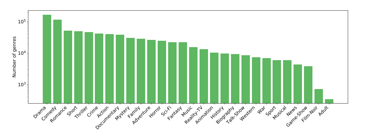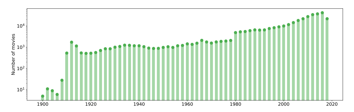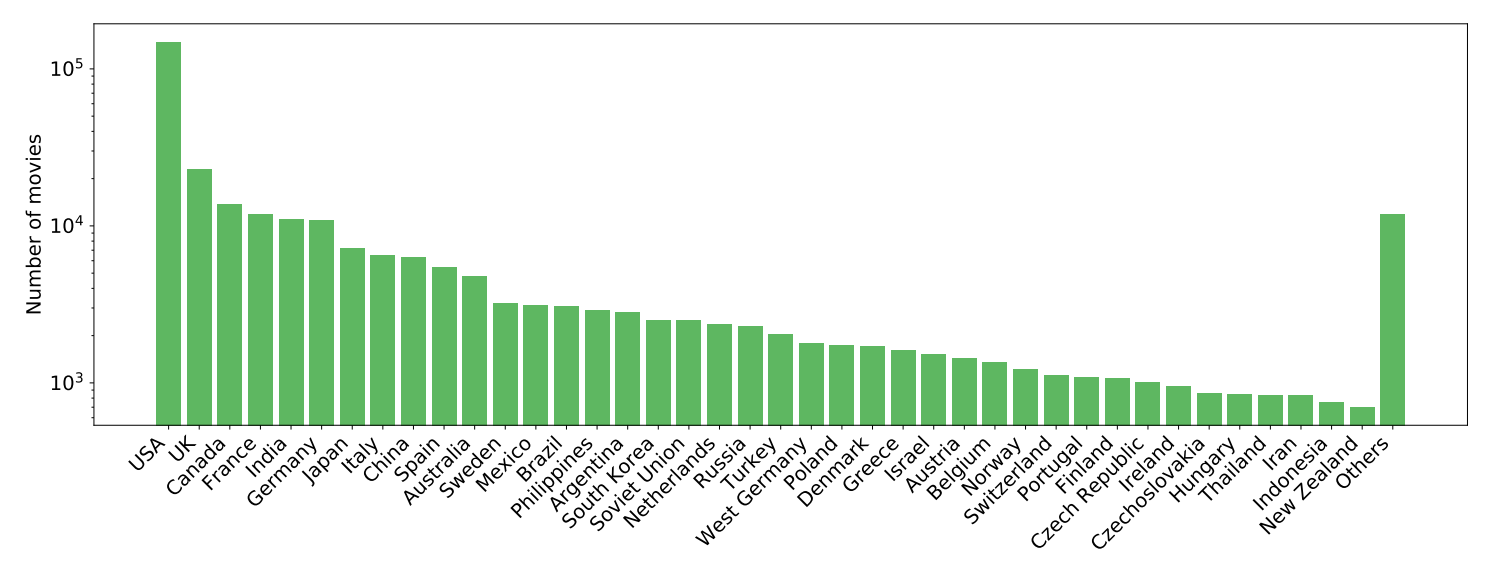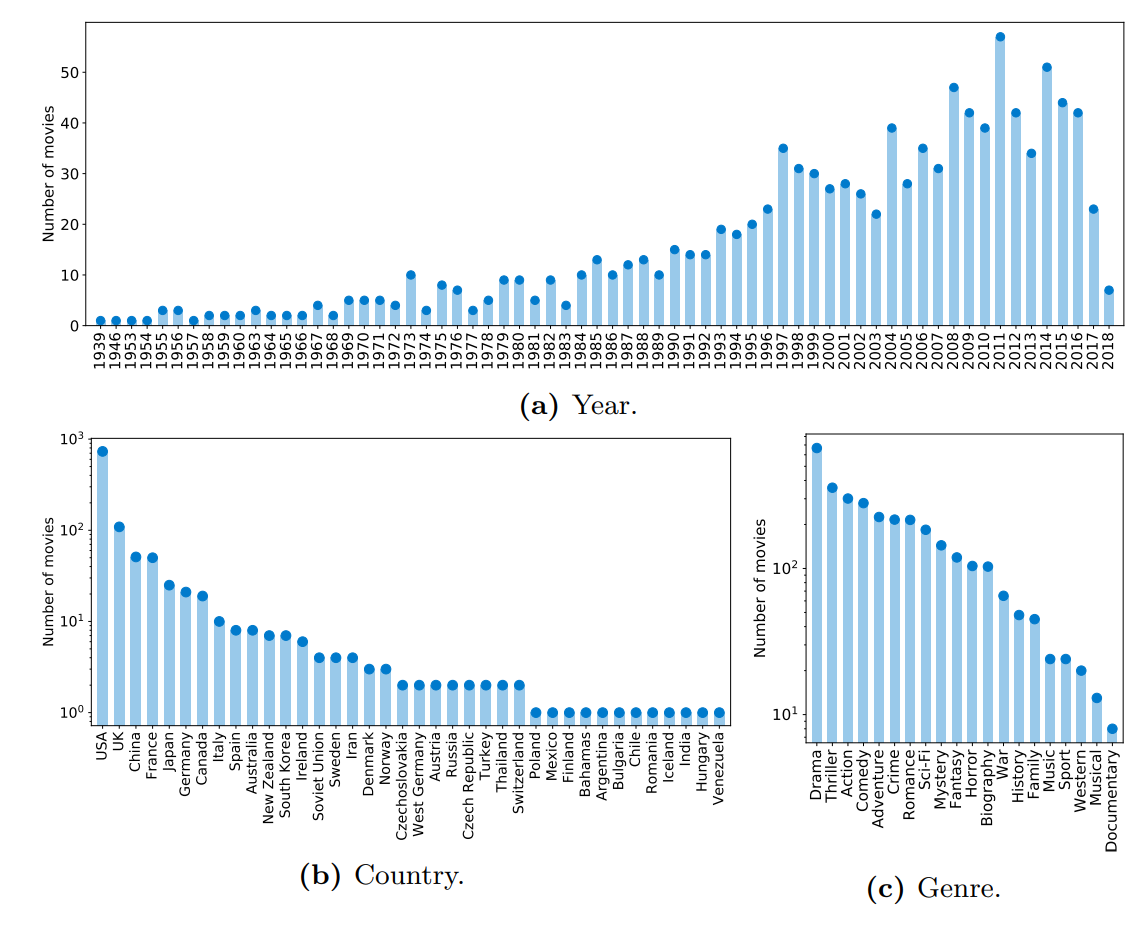 图A7:MovieNet中1100部电影的发行年份、国家和类型分布(国家和类型的y轴采用对数刻度)。